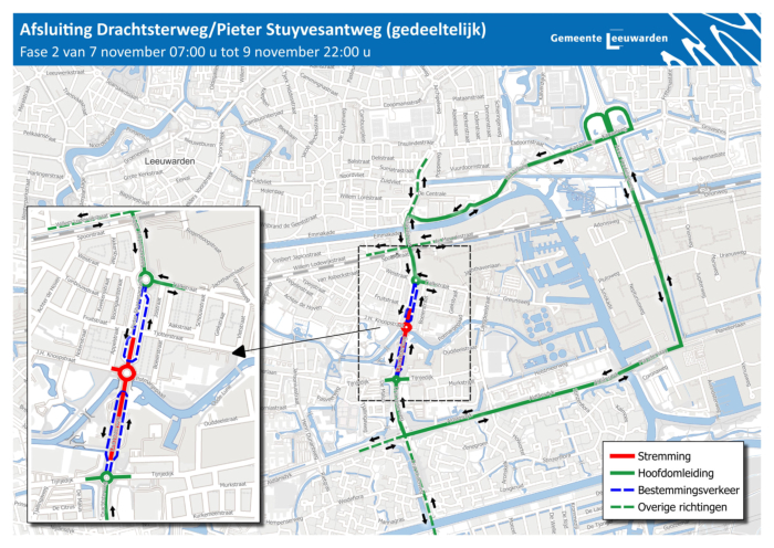 Vanaf 31 oktober beginnen er onderhoudswerkzaamheden aan een deel van de Drachtsterweg en de Pieter Stuyvesantweg. Op de deze pagina vindt u meer informatie en afbeeldingen van de omleid routes en wanneer de werkzaamheden zullen plaats vinden.Beste bewoner,Een deel van de Drachtsterweg en Pieter Stuyvesantweg is toe aan onderhoud enwordt opnieuw geasfalteerd. Vanaf 31 oktober beginnen wij daarom met onderhoudswerkzaamheden tussen de rotonde Tijnjedyk en het spoor bij de Julianastraat. In deze brief leest u wat er gaat gebeuren en wat dit voor u betekent.Planning en omleidingDe werkzaamheden staan gepland voor drie weekenden:1. 31 oktober (07:00 uur) - 2 november (22:00 uur)2. 7 november (07:00 uur) - 9 november (22:00 uur)3. 14 november (07:00 uur) - 16 november (22:00 uur)Voor wat betreft het verkeer gelden de volgende aandachtspunten:- In deze weekenden kunt u niet met de auto of motor doorrijden op dehoofdrijbaan van de Drachtsterweg en Pieter Stuyvesantweg.- De omliggende bedrijven aan deze wegen zijn bereikbaar via deparallelwegen.- Dit geldt ook voor de bedrijven aan de Tijnjedyk.- Fietsers en voetgangers kunnen er gewoon langs.- Bestemmingsverkeer voor Achter de Hoven en de Schepenbuurt volgeneen omleidingsroute.- Per weekend verschillen de werkzaamheden en de omleidingsroutes.Bijgevoegde kaarten laten dit zien.GeluidHet weghalen van het oude asfalt (frezen) kan geluid geven. Dit werk doen weoverdag zodat u er zo min mogelijk last van heeft. We proberen de overlast zoklein mogelijk te houden. Bijvoorbeeld door het werk goed te plannen enmachines niet langer te gebruiken dan nodig isKlik op afbeelding voor vergroting