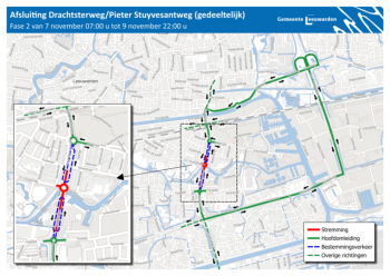 Vanaf 31 oktober beginnen er onderhoudswerkzaamheden aan een deel van de Drachtsterweg en de Pieter Stuyvesantweg. Op de deze pagina vindt u meer informatie en afbeeldingen van de omleid routes en wanneer de werkzaamheden zullen plaats vinden.Beste bewoner,EendeelvandeDrachtsterwegenPieterStuyvesantwegistoeaanonderhoudenwordtopnieuwgeasfalteerd.Vanaf31oktoberbeginnenwijdaarom met onderhoudswerkzaamheden tussen de rotonde Tijnjedyk en het spoor bij de Julianastraat. In deze brief leest u wat er gaat gebeuren en wat dit voor u betekent.Planning en omleidingDe werkzaamheden staan gepland voor drie weekenden:1. 31 oktober (07:00 uur) - 2 november (22:00 uur)2. 7 november (07:00 uur) - 9 november (22:00 uur)3. 14 november (07:00 uur) - 16 november (22:00 uur)Voor wat betreft het verkeer gelden de volgende aandachtspunten:- In deze weekenden kunt u niet met de auto of motor doorrijden op dehoofdrijbaan van de Drachtsterweg en Pieter Stuyvesantweg.- De omliggende bedrijven aan deze wegen zijn bereikbaar via deparallelwegen.- Dit geldt ook voor de bedrijven aan de Tijnjedyk.- Fietsers en voetgangers kunnen er gewoon langs.- Bestemmingsverkeer voor Achter de Hoven en de Schepenbuurt volgeneen omleidingsroute.- Per weekend verschillen de werkzaamheden en de omleidingsroutes.Bijgevoegde kaarten laten dit zien.GeluidHet weghalen van het oude asfalt (frezen) kan geluid geven. Dit werk doen weoverdag zodat u er zo min mogelijk last van heeft. We proberen de overlast zoklein mogelijk te houden. Bijvoorbeeld door het werk goed te plannen enmachines niet langer te gebruiken dan nodig isKlik op afbeelding voor vergroting