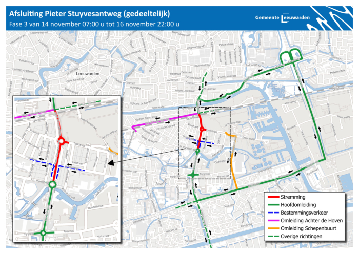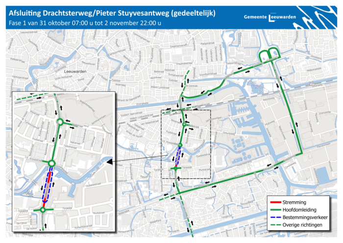 Vanaf 31 oktober beginnen er onderhoudswerkzaamheden aan een deel van de Drachtsterweg en de Pieter Stuyvesantweg. Op de deze pagina vindt u meer informatie en afbeeldingen van de omleid routes en wanneer de werkzaamheden zullen plaats vinden.Beste bewoner,Een deel van de Drachtsterweg en Pieter Stuyvesantweg is toe aan onderhoud enwordt opnieuw geasfalteerd. Vanaf 31 oktober beginnen wij daarom met onderhoudswerkzaamheden tussen de rotonde Tijnjedyk en het spoor bij de Julianastraat. In deze brief leest u wat er gaat gebeuren en wat dit voor u betekent.Planning en omleidingDe werkzaamheden staan gepland voor drie weekenden:1. 31 oktober (07:00 uur) - 2 november (22:00 uur)2. 7 november (07:00 uur) - 9 november (22:00 uur)3. 14 november (07:00 uur) - 16 november (22:00 uur)Voor wat betreft het verkeer gelden de volgende aandachtspunten:- In deze weekenden kunt u niet met de auto of motor doorrijden op dehoofdrijbaan van de Drachtsterweg en Pieter Stuyvesantweg.- De omliggende bedrijven aan deze wegen zijn bereikbaar via deparallelwegen.- Dit geldt ook voor de bedrijven aan de Tijnjedyk.- Fietsers en voetgangers kunnen er gewoon langs.- Bestemmingsverkeer voor Achter de Hoven en de Schepenbuurt volgeneen omleidingsroute.- Per weekend verschillen de werkzaamheden en de omleidingsroutes.Bijgevoegde kaarten laten dit zien.GeluidHet weghalen van het oude asfalt (frezen) kan geluid geven. Dit werk doen weoverdag zodat u er zo min mogelijk last van heeft. We proberen de overlast zoklein mogelijk te houden. Bijvoorbeeld door het werk goed te plannen enmachines niet langer te gebruiken dan nodig isKlik op afbeelding voor vergroting