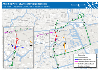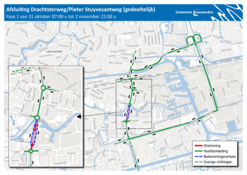 Vanaf 31 oktober beginnen er onderhoudswerkzaamheden aan een deel van de Drachtsterweg en de Pieter Stuyvesantweg. Op de deze pagina vindt u meer informatie en afbeeldingen van de omleid routes en wanneer de werkzaamheden zullen plaats vinden.Beste bewoner,EendeelvandeDrachtsterwegenPieterStuyvesantwegistoeaanonderhoudenwordtopnieuwgeasfalteerd.Vanaf31oktoberbeginnenwijdaarom met onderhoudswerkzaamheden tussen de rotonde Tijnjedyk en het spoor bij de Julianastraat. In deze brief leest u wat er gaat gebeuren en wat dit voor u betekent.Planning en omleidingDe werkzaamheden staan gepland voor drie weekenden:1. 31 oktober (07:00 uur) - 2 november (22:00 uur)2. 7 november (07:00 uur) - 9 november (22:00 uur)3. 14 november (07:00 uur) - 16 november (22:00 uur)Voor wat betreft het verkeer gelden de volgende aandachtspunten:- In deze weekenden kunt u niet met de auto of motor doorrijden op dehoofdrijbaan van de Drachtsterweg en Pieter Stuyvesantweg.- De omliggende bedrijven aan deze wegen zijn bereikbaar via deparallelwegen.- Dit geldt ook voor de bedrijven aan de Tijnjedyk.- Fietsers en voetgangers kunnen er gewoon langs.- Bestemmingsverkeer voor Achter de Hoven en de Schepenbuurt volgeneen omleidingsroute.- Per weekend verschillen de werkzaamheden en de omleidingsroutes.Bijgevoegde kaarten laten dit zien.GeluidHet weghalen van het oude asfalt (frezen) kan geluid geven. Dit werk doen weoverdag zodat u er zo min mogelijk last van heeft. We proberen de overlast zoklein mogelijk te houden. Bijvoorbeeld door het werk goed te plannen enmachines niet langer te gebruiken dan nodig isKlik op afbeelding voor vergroting